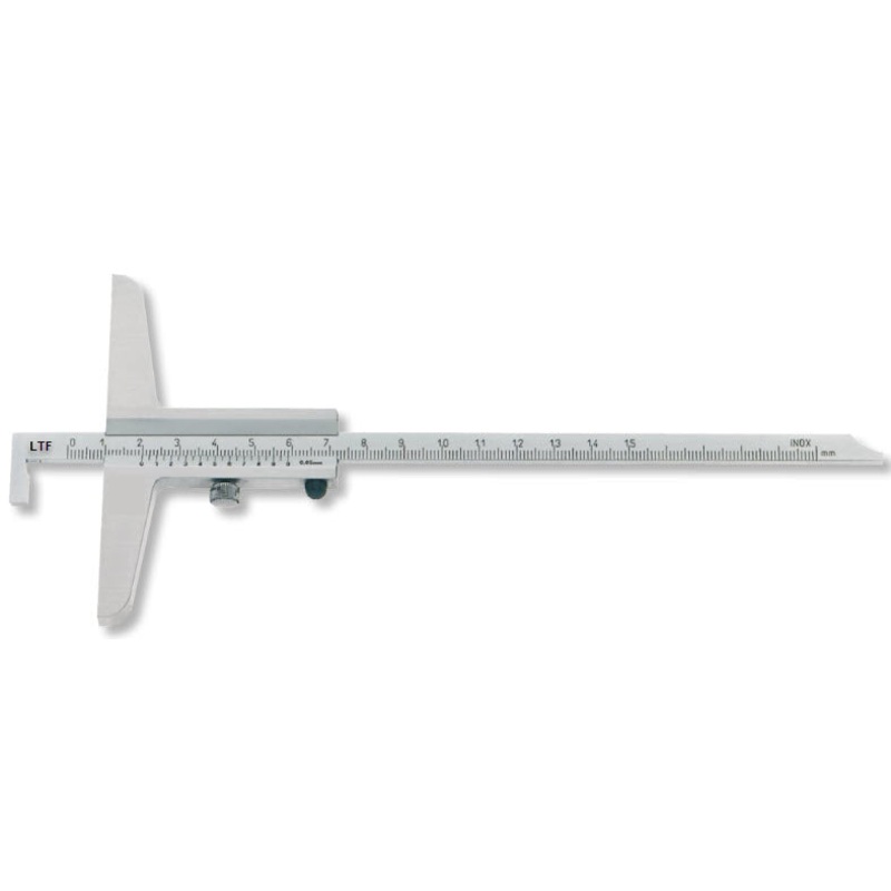 Depth calipers with or without hook. The models with a hook have graduations on both sides of the scale, allowing reverse usage (i.e. without hook) of the instrument. Measuring range: 0 -150mm x 80mm base Vernier: 0.05 mm. Matt chrome-plated vernier. Locki