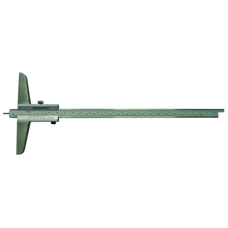 Depth calipers with or without hook. The models with a hook have graduations on both sides of the scale, allowing reverse usage (i.e. without hook) of the instrument. Measuring range: 0 -250 mm. Vernier: 0.02 mm. Matt chrome-plated vernier. Locking screw.