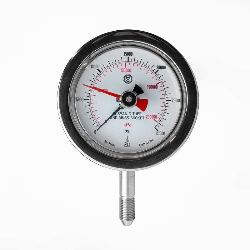 A maximum indicating pointer on a pressure gauge consists of a free moving red pointerpositioned behind the main black pointer. Sometimes referred to as a tell-tale/tattle-tale pointer ordrag pointer, it records themaximum pressurethe gauge has experienced. As pressure increases, the black needle moves upward, carrying the red needle along with it. When pressure decreases, the black needle returns to zero, while the red needle remains in place. Users can determine the maximum pressure reached by observing the red needle. A small dial in the center is used to reset the pointer.