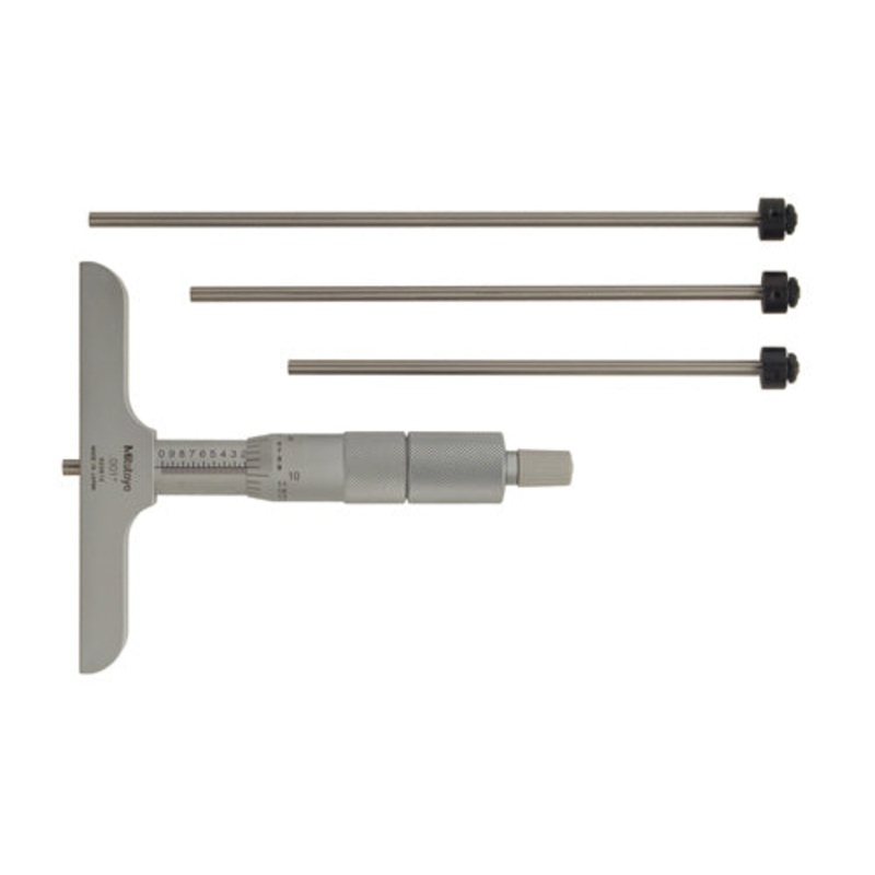 Mitutoyo; Depth Micrometer This interchangeable rod type micrometer can be used for wide range measurements.It offers you the following benefits: 4 mm interchangeable rods, with lapped measuring surfaces, enable you to make wide-range measurement. The ratc