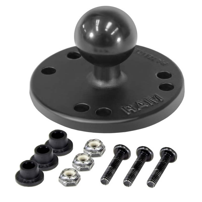 The RAM-B-202U-RYM1 consists of a 1″ diameter rubber ball connected to a flat 2.5″ diameter base. The base has pre-drilled holes, including the universal AMPs hole pattern. Included are (3 quantity) (#8-32 x 3/4″ PH PD Mach Screws) and (3 quantity) (#8-32 SS Nylock Nuts) that will connect the RAM-B-202U-RYM1 to the bottom of all Raymariner DragonflyT Sonar/GPS devices.