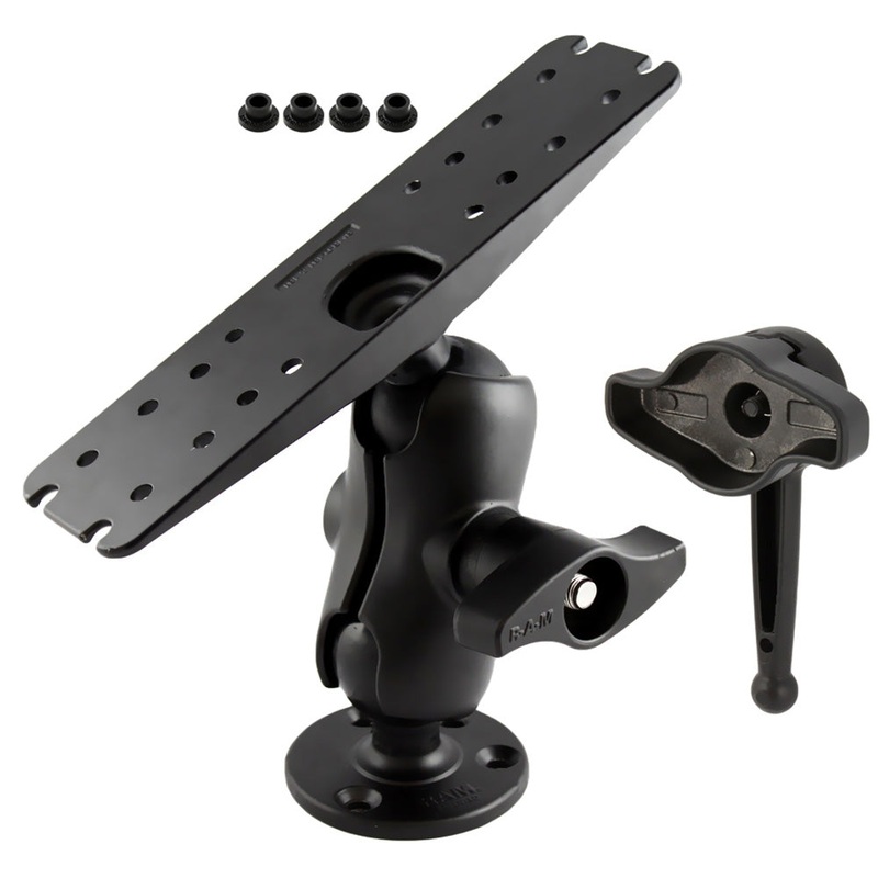 The RAM-D-111U-C consists of a short double socket arm, 3.68″ diameter round base and 11″ x 3″ rectangular base. The round base contains pre-drilled holes, including two holes at 180 degrees and three holes at 120 degrees. The rectangle base contains different combinations of pre-drilled holes which will match up to many electronic devices and mounts, including Marine GPS, CB Radios, Ham Radios, Gimbal Brackets and more.