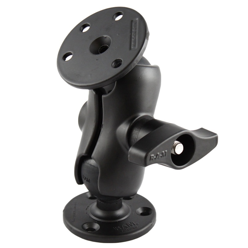 The RAM-D-101U consists of (2 qty) 3.68″ diameter round bases and SHORT length double socket arm. The 3.68″ diameter round bases have pre-drilled holes, including two holes at 180 degrees and three holes at 120 degrees. Designed into the mount is a 2.25″ diameter patented rubber ball and socket system with adjustment points at both socket ends of the arm.