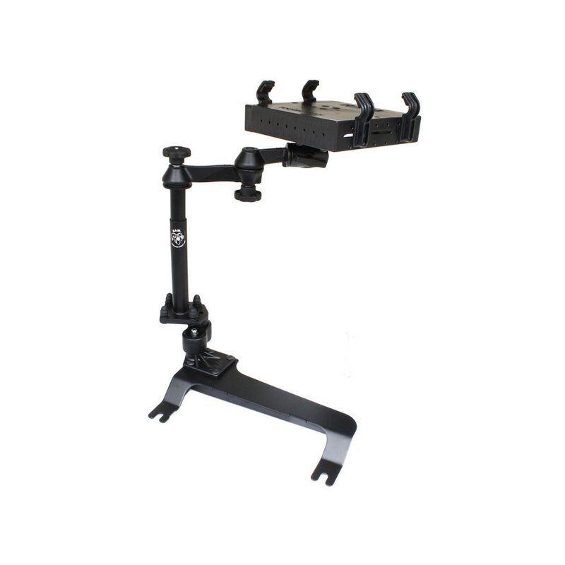 This No-Drill Laptop Stand System installs quickly and easily into the specified vehicles using the existing hardware of the passenger side seat rails. This configuration provides a telescoping feature that ranges from 12 to 18 inches. Dual swing arms provide articulation and 12 inches of reach for passenger and driver access to the mounted device. Patented rubber ball and socket joint provides additional adjustment as well as shock and vibration isolation. The RAM Tough Tray is spring loaded to accommodate 10″ to 16″ wide laptops & (17″ wide screens). The tray features four adjustable retaining arms with rubber grip feature. These arms can be moved both vertically and horizontally. This allows for a custom fit for varying thicknesses of laptops and the freedom of not blocking ports or drives. A screen support and USB light are also available to accessorize the tray. Hole patterns on perimeter of tray facilitate the mounting of additional RAM systems to support GPS or other electronics.