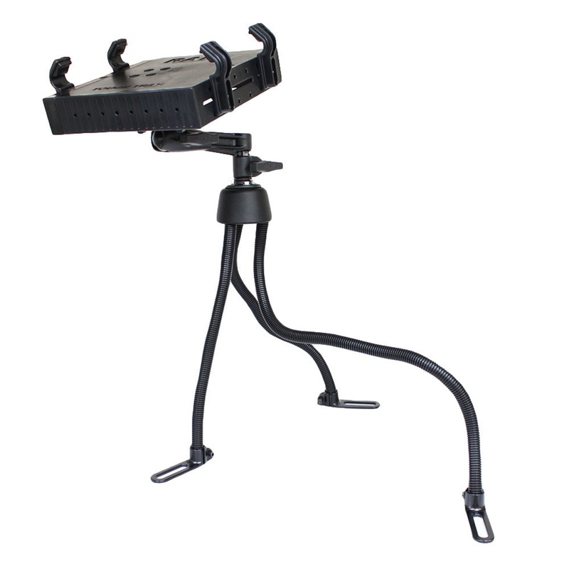 RAM POD III Universal No-Drill Laptop Mount w/Tough-TrayThe RAM-316-3SW1U consists of the RAM POD III No-Drill vehicle base, three rigid aluminum rod legs, ratchet swing arm and RAM Tough-Tray. The base of the mount connects to your seat rail without any d