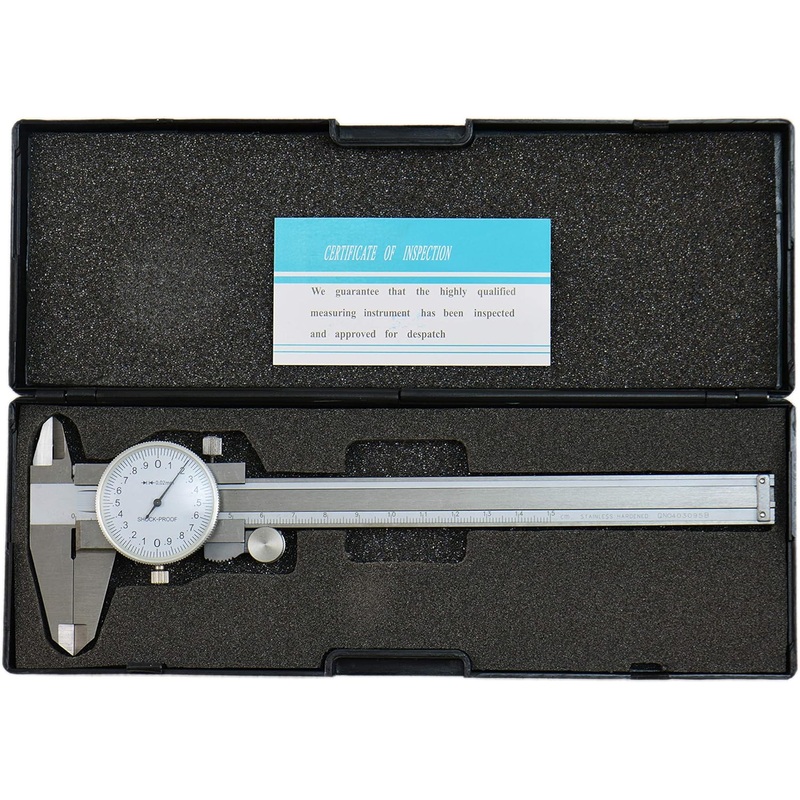 Shars Dial Caliper 150mm X .02mm Resolution Code 303-1306 MAXIMUM MEASURING RANGE: 150mm; JAW DEPTH: 1-9/16" ACCURACY: 0.03mm; RANGE PER REVOLUTION: 2mm GRADUATION: 0.02mm; MATERIAL: Stainless Steel PRODUCT INCLUDED: - Fitted case; - Thumb roller