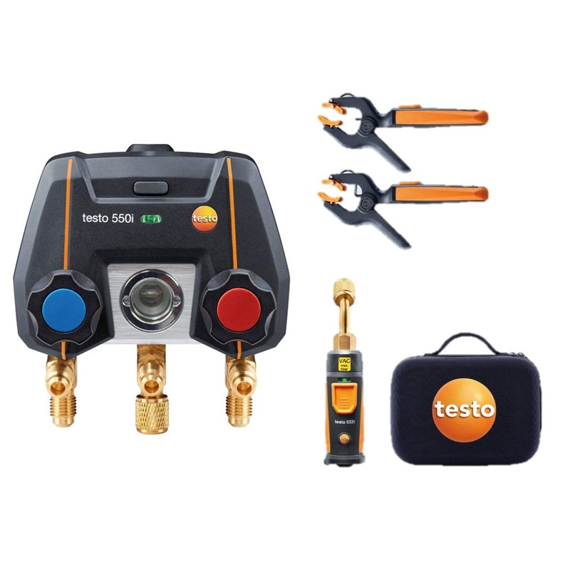 The kit for app-controlled, wireless measurements and digital documentation on your smartphone. You will get the testo 550i app-controlled digital manifold with Bluetooth, 2-way valve block and sturdy hook, testo 552i wireless vaccum probe (Bluetooth), two testo 115i wireless clamp thermometers (Bluetooth, NTC) and a robust transport case. For other wireless measurements, the optional Testo Smart Probes for temperature, humidity and vacuum are the perfect addition. Youll be ideally equipped to carry out your measuring tasks on refrigeration and air conditioning systems and also heat pumps.